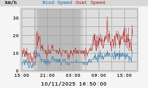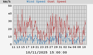 max: 19 km/h at 02/11/2025 22:30:00 max gust: 39 km/h at 02/11/2025 19:14:27
